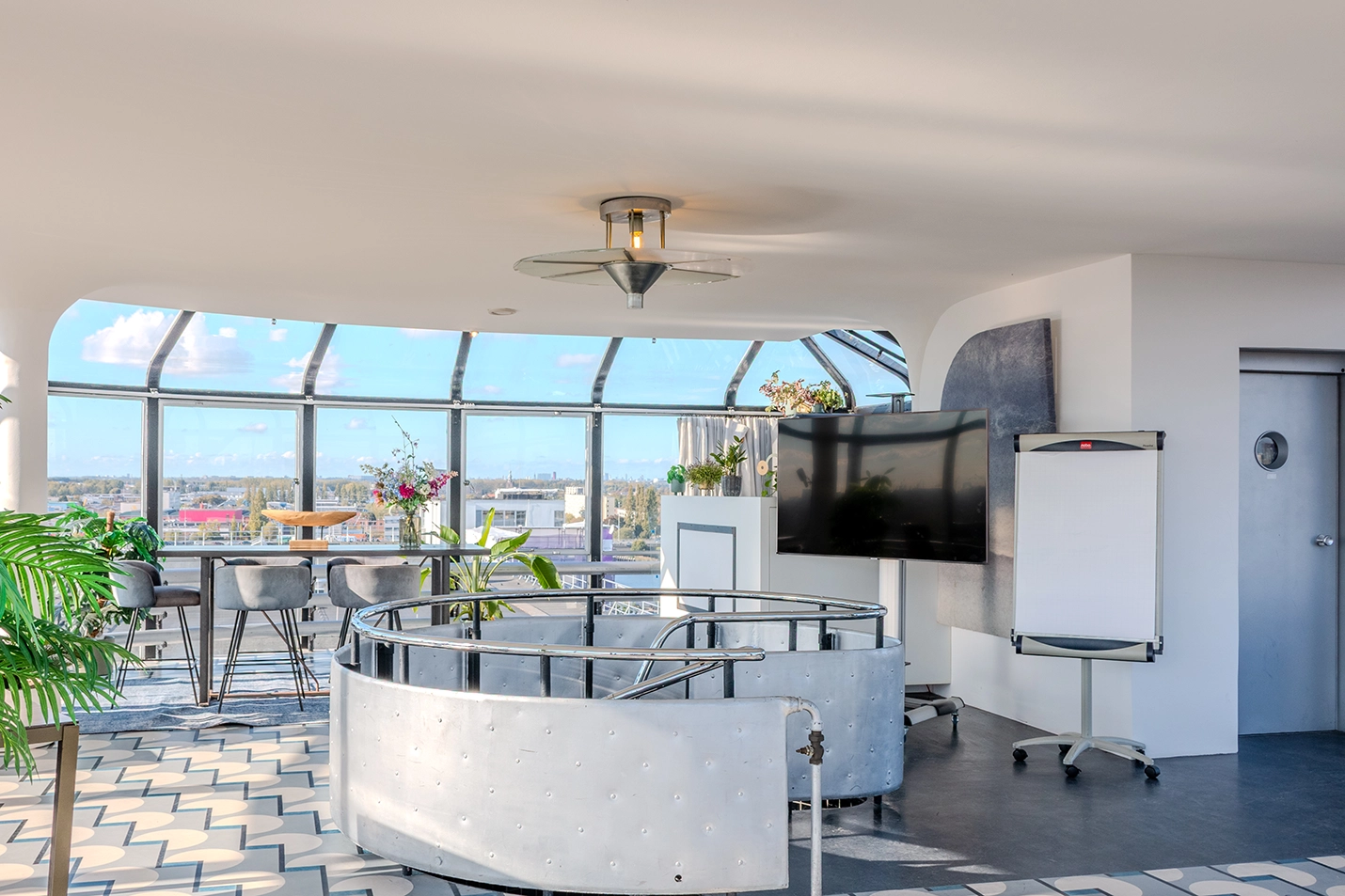 De Tearoom is een bijzondere ronde glazen koepel bovenop het dak van de Van Nellefabriek en behoort tot de meest unieke locaties van het gebouw. Dankzij het 360-graden uitzicht over Rotterdam vormt deze ruimte een indrukwekkend decor voor vergaderingen, presentaties of borrels die nét dat beetje extra mogen hebben.